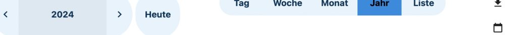 Die Kalenderansicht kann mit den entsprechenden Buttons (Tag, Woche, Monat, Liste) umgeschaltet werden. Hinweis: Bei Verwendung bestimmter Browser (etwa Firefox – aber. nicht Safari) kann durch Klicken in der Kopfzeile des Kalendars (Muster siehe unterhalb dieses Absatzes) auf das Pfeilsymbol ⬇︎(erstes Zeichen von rechts) geht ein Fenster im Browser auf, dann die oberste Datei anklicken und den angezeigten Anweisungen folgen. So wird eine ics-Datei mit allen Terminen heruntergeladen werden. Bei Schwierigkeiten schickt eine E-Mail an Kalenderhilfe, wir helfen weiter.